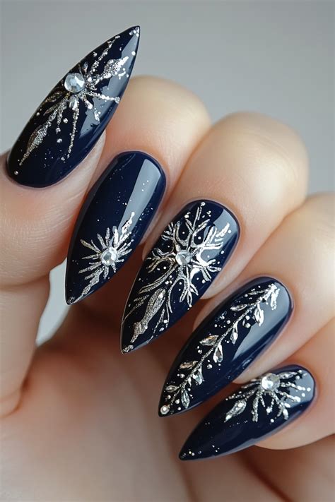 Seize the mesmerizing fantastic thing about a winter night time sky in your nails. Paint a base coat of deep navy blue or black, then use a sponge to dab on shades of white, lavender, and silver, making a galaxy-like impact. End with a prime coat to boost the ethereal shimmer.