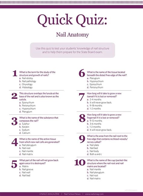 Nail quizzes usually cowl a variety of matters associated to nail care, together with: