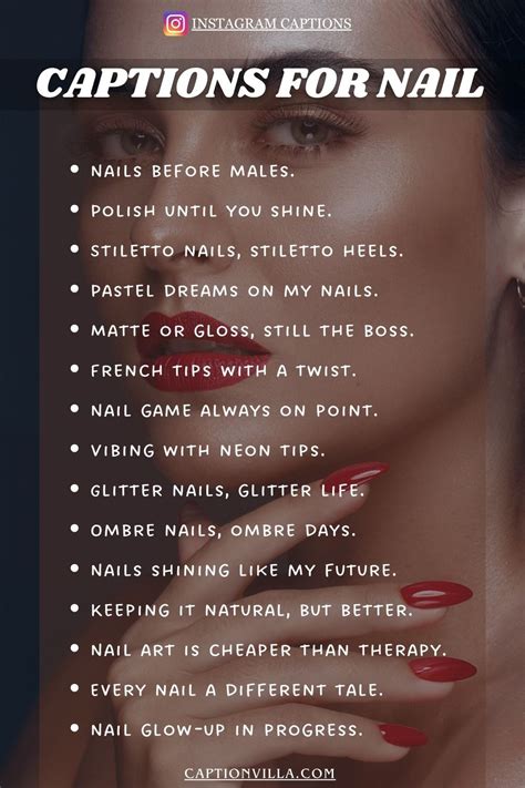 Let your creativity shine by means of with captions that showcase your distinctive nail artwork designs. Use phrases like "Creative expression" and "Nail canvas" to convey the artistic course of behind your gorgeous masterpieces.
